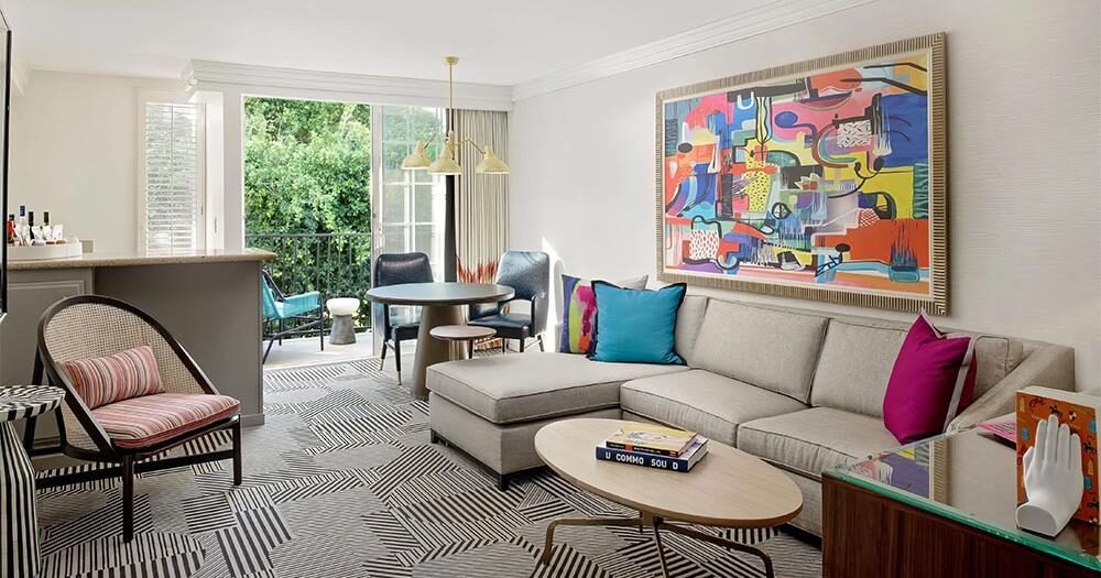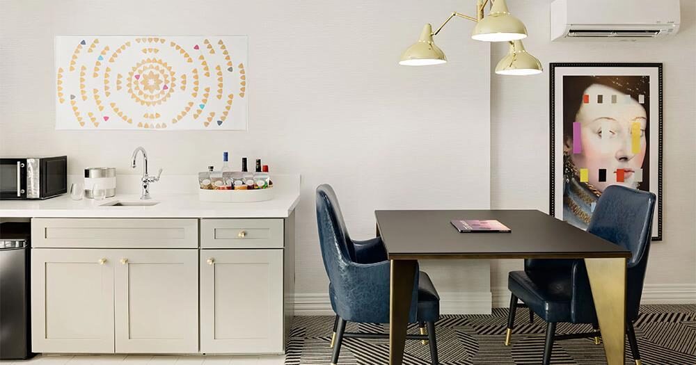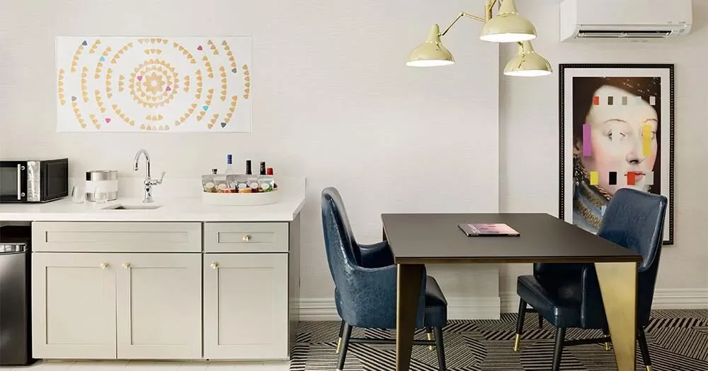 Enjoy one of the largest suites in West Hollywood! This redesigned suite is approximately 1,000 square feet providing you the perfect home away from home in an ideal corner location with designer details throughout. This luxurious suite features a separate bedroom for added privacy with a king bed and a 55″ flat screen television. The suite is equipped with top of the line amenities including a living room with a sleeper sofa, fireplace, 55” flat screen television, kitchenette, mini fridge, Keurig coffee maker, balcony, and is both mobility and hearing accessible. They include accessible features in the bathroom, visual fire alarms, and braille on every door placard. Learn more about our hotel accessibility here.