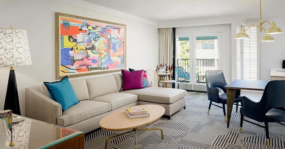 Newly renovated and measuring at approximately 700 square feet, this suite is sweet! Indulge with two queen beds in a bedding area, a sleeper sofa, fireplace, two 55″ flat screen televisions, balcony, mini fridge, kitchenette with Keurig coffee maker, and the fact that the suite is both mobility and hearing accessible. They include accessible features in the bathroom, visual fire alarms, and braille on every door placard. Learn more about our hotel accessibility here.